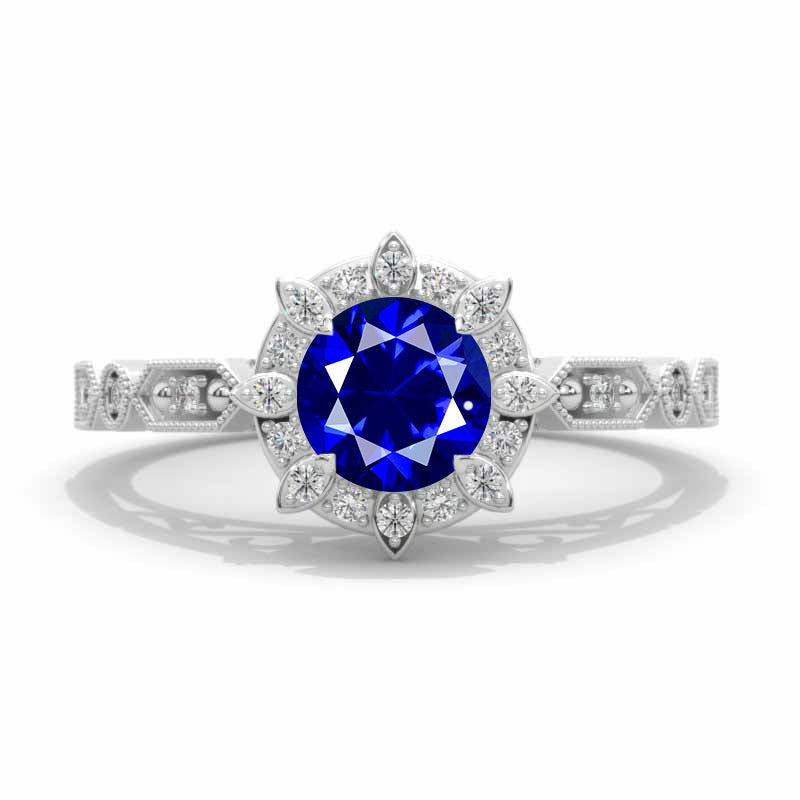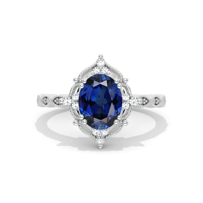 14K White Gold 2 Carat Oval Royal Blue Sapphire Halo Vintage Engagement Ring, Eternity Ring Set