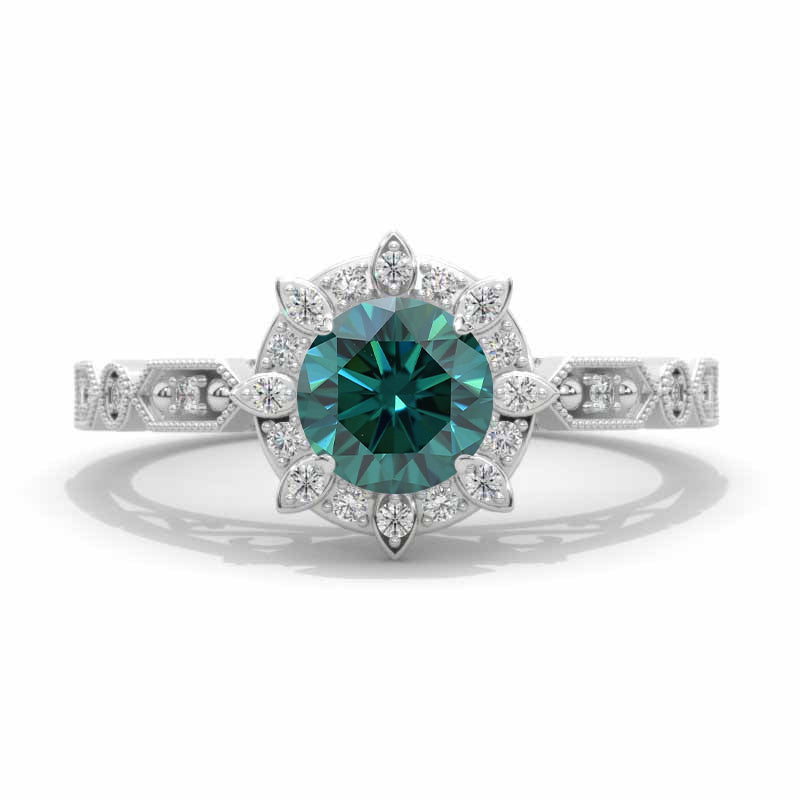 14K White Gold 2 Carat Oval Green Moissanite Halo Vintage Engagement Ring, Eternity Ring Set