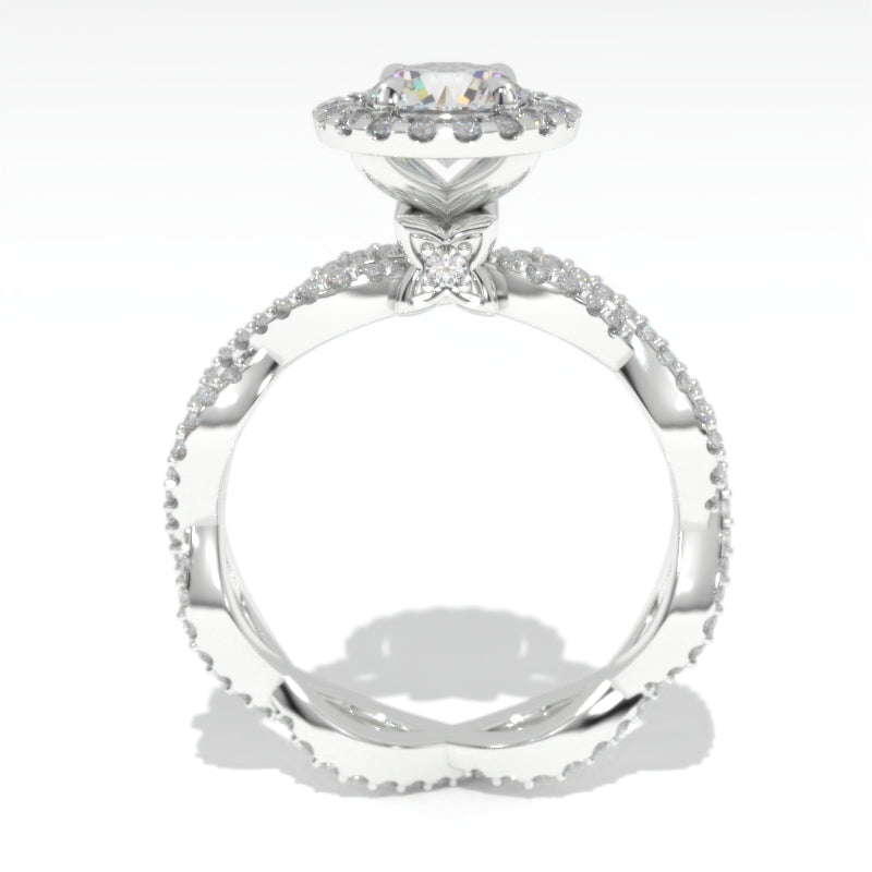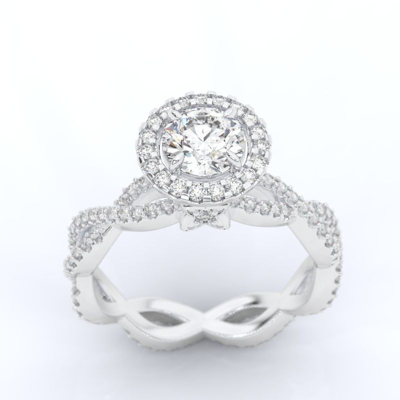This one of a kind ring features beautiful lattice design which embeds gorgeous jewels of your choice and elegantly twists into the main center stone (images featuring moissanite).