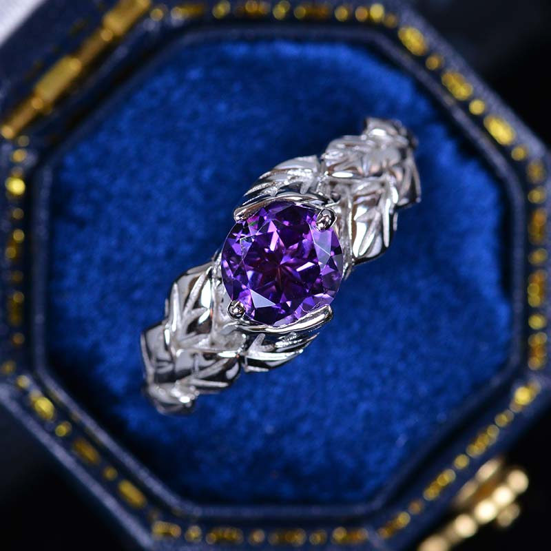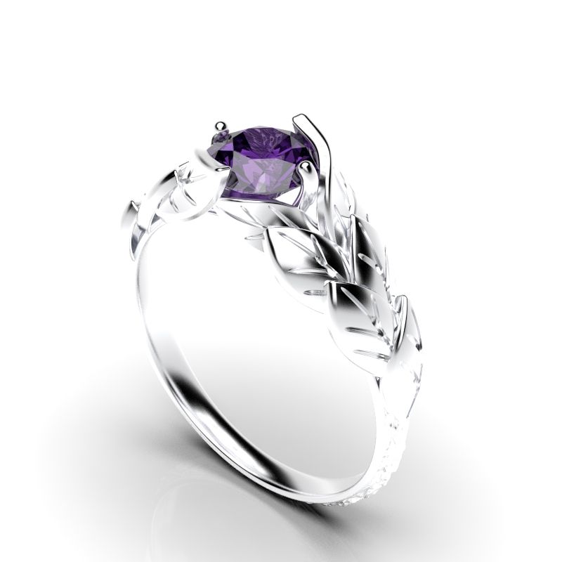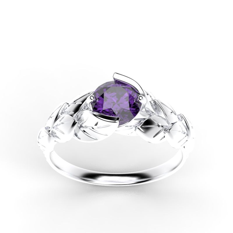 14K White Gold 1.0 Carat Amethyst Leaf Engagement Ring 6mm Round - Giliarto