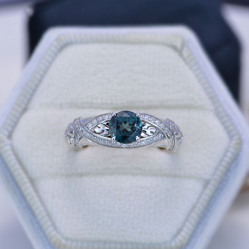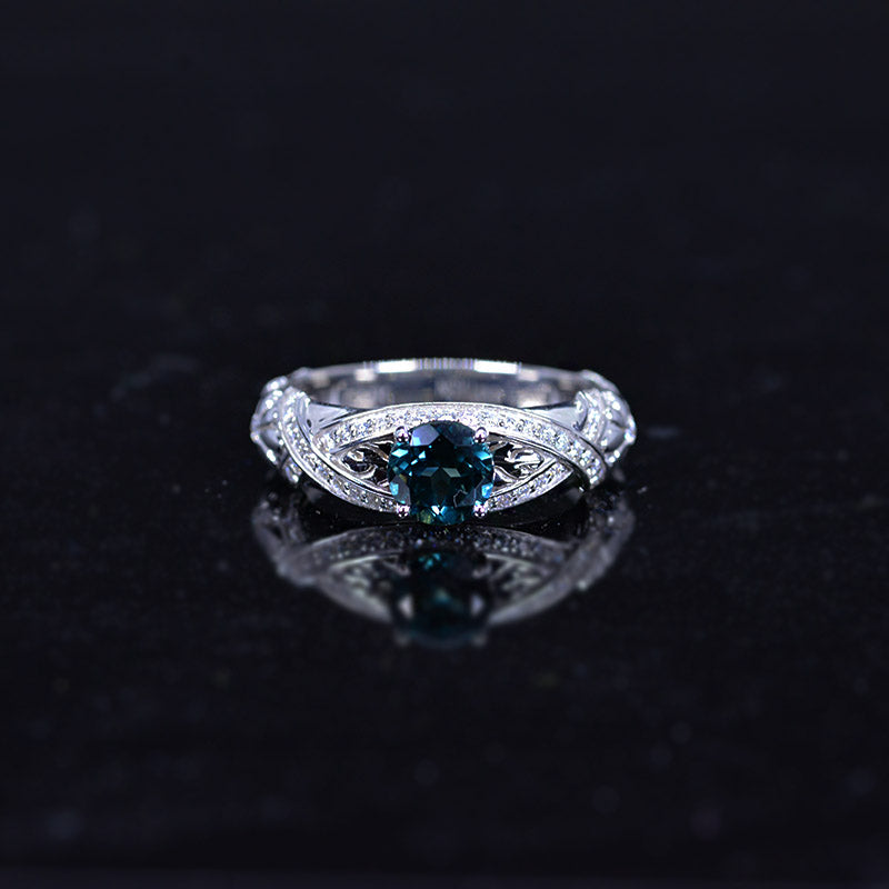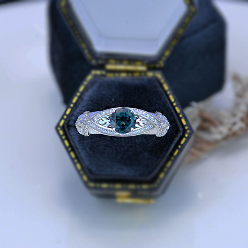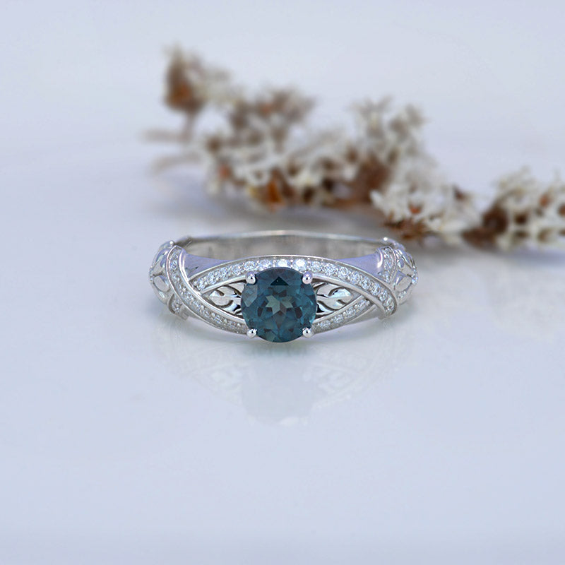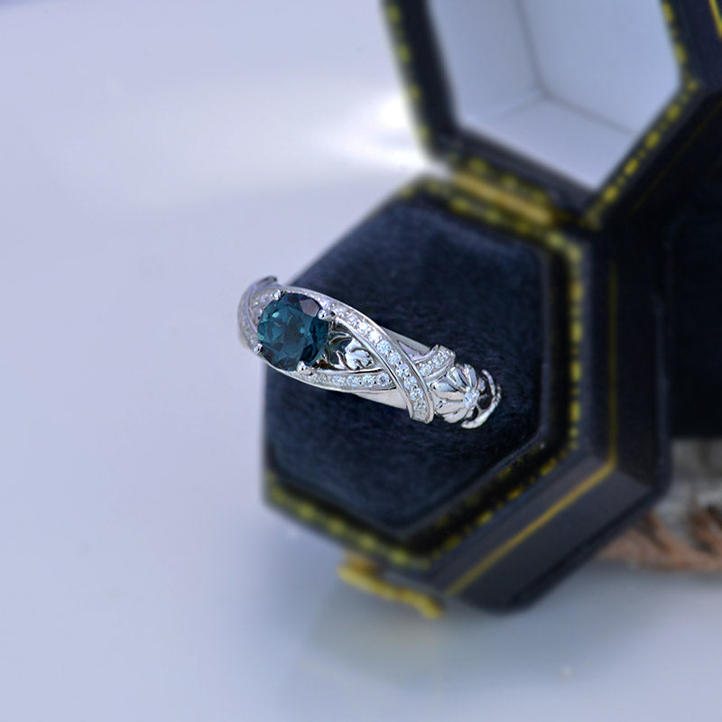 Green Teal Sapphire White Gold Floral Engagement Ring