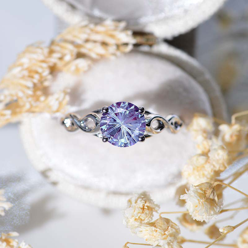 1.0 Carat Fireworks Cut Ethically LAB-Grown Alexandrite (Round 7 mm, Ex-Cut, Ex-Polish, VG-Symmetry)   in 14K White Gold  Ring.