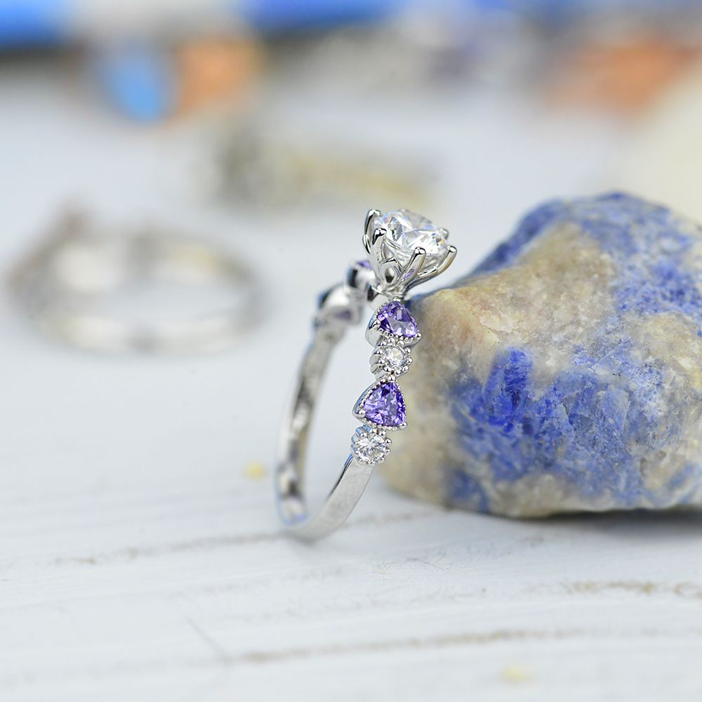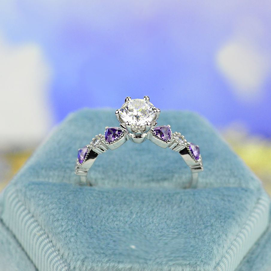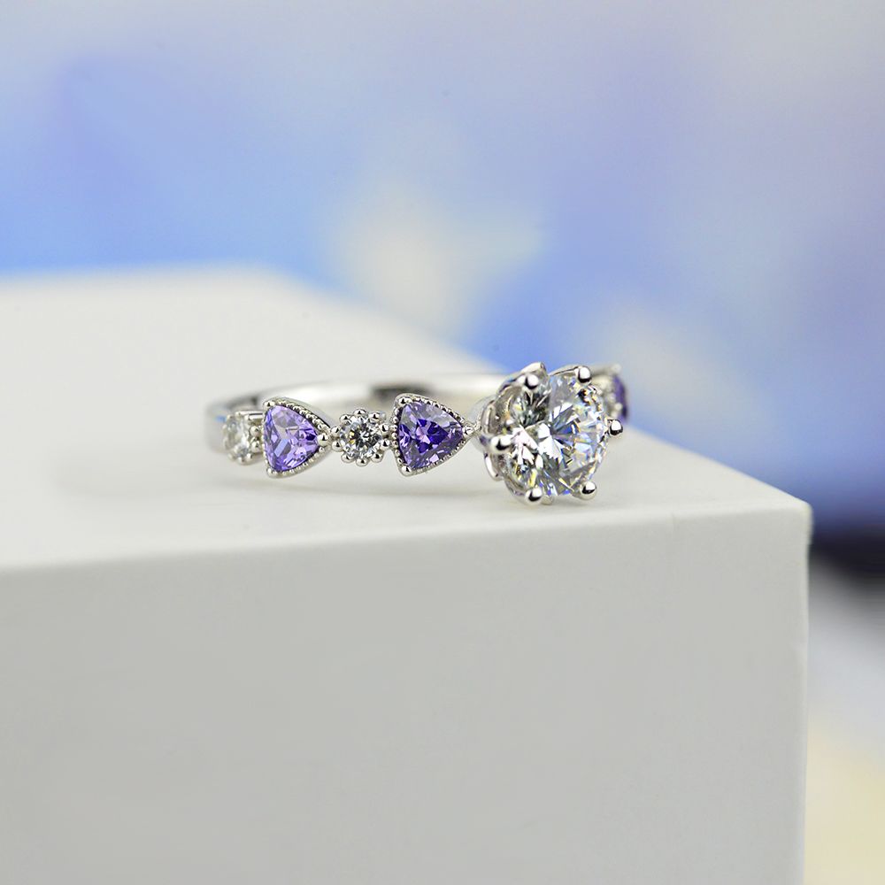 Giliarto Moissanite Center Stones Round 6mm, Ex-Cut, Ex-Polish, VG-Symmetry and 4 Accent Amethyst Trillion Stones with 2 mm Round Moissanite in 14K White Gold Promissory Ring.