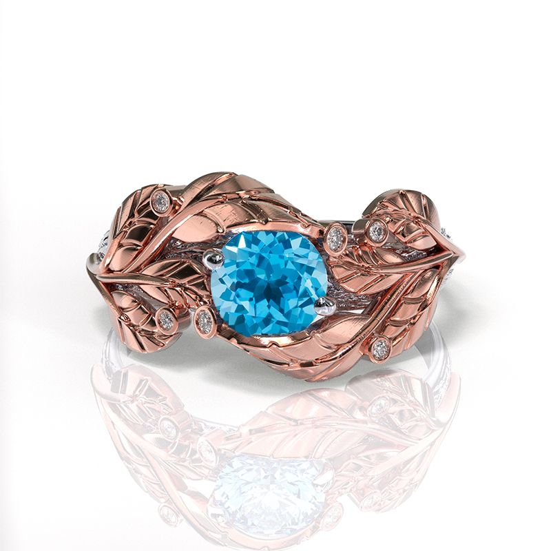 Genuine Aquamarine Center Stone ( 6mm Round, AAAA-Grade, VVS1-Clarity, Ex-Cut, Ex-Polish, VG-Symmetry) and 6 Natural Diamond Accents (0.03 CTW) in 14K Rose and White Gold.