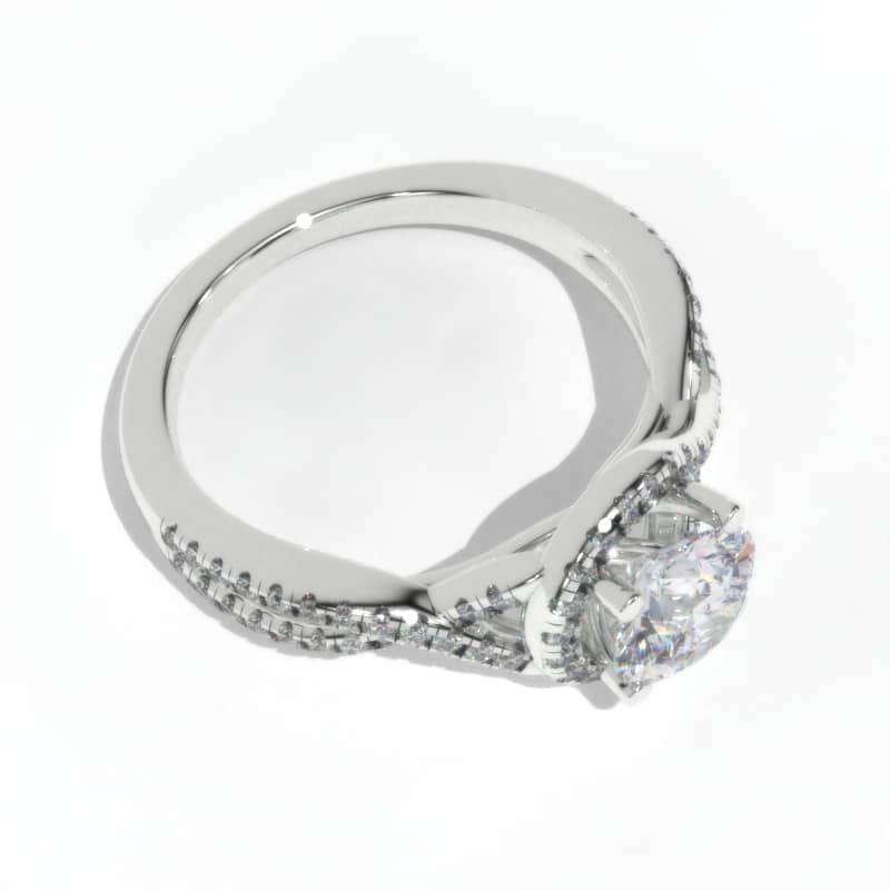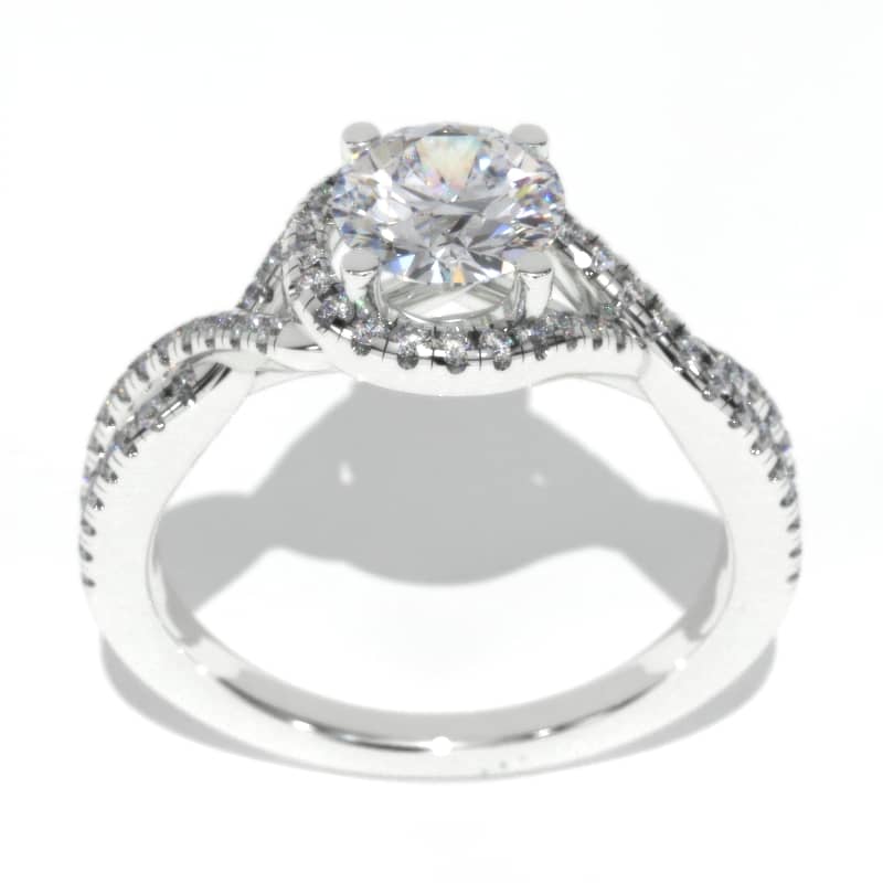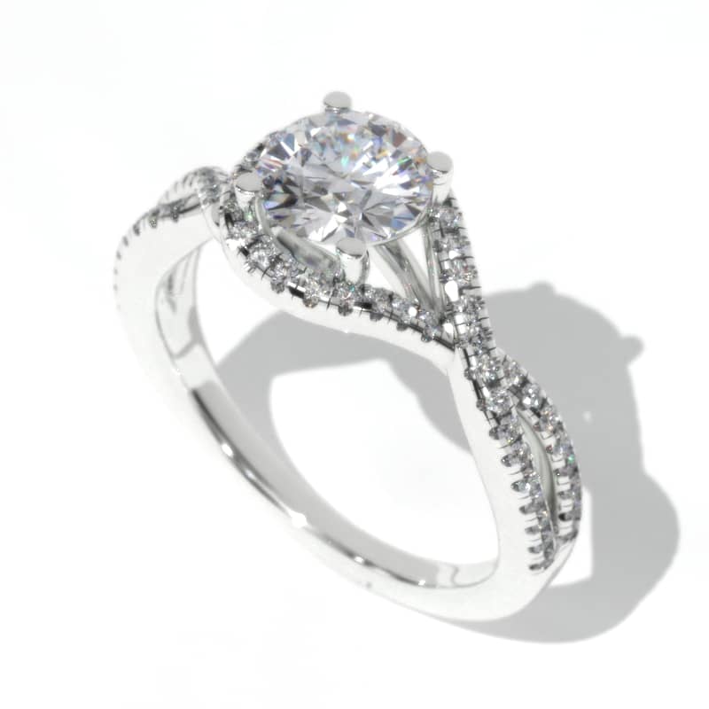 1.25 Carat Giliarto Moissanite Round 6.5mm D-Colorless, VVS1-Clarity, VG-Cut, Ex-Polish, VG-Symmetry Center Stone and 62-0.35 C.T.W. D-Colorless, VVS1 clarity Accent Stones in 14K White Gold Ring.Â