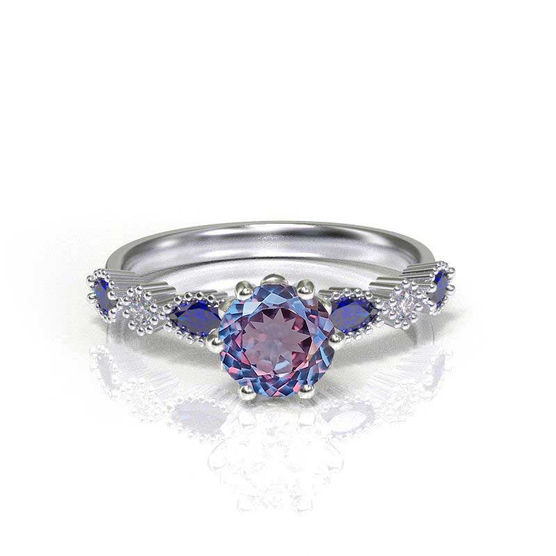 1.0 Carat Portuguese Cut Ethically Lab-Grown Alexandrite Center Stones ( Round 6mm, Ex-Cut, Ex-Polish, VG-Symmetry) and 6 Accent Blue And White Sapphire  Stones in 14K White  Gold.