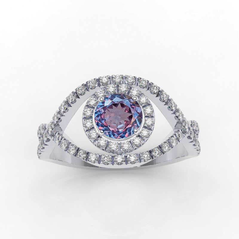 1.0 Carat Portuguese Cut Ethically Lab-Grown Alexandrite Center Stone ( Round 6 mm, Ex-Cut, Ex-Polish, VG-Symmetry) and 66 Accent Diamond  Stones (0.3 CTW  G-H colourI1 clarity) with  14K White Gold.