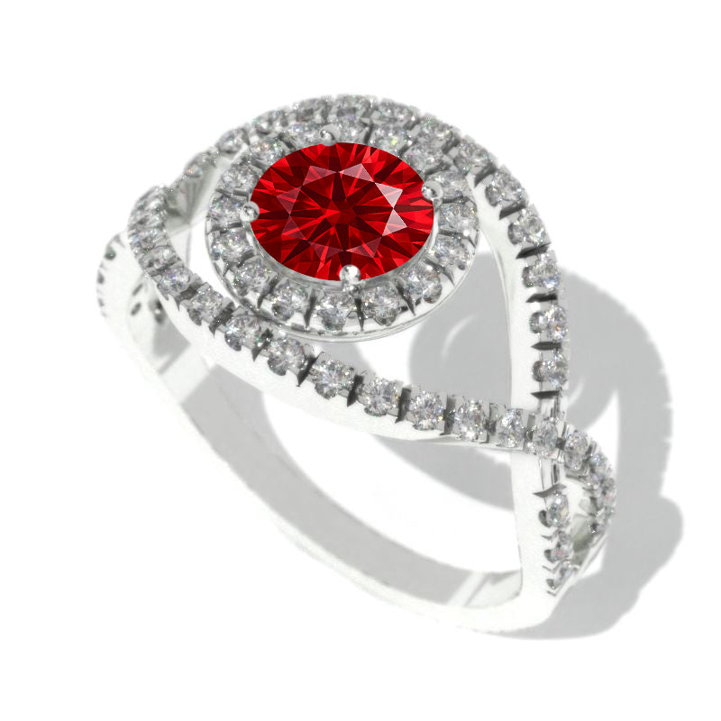 1.0 Carat Ethically Lab-Grown Ruby AAA+ Grade Center Stone ( Round 6mm, Ex-Cut, Ex-Polish, VG-Symmetry) and 66 Accent Stones (0.3 CTW D-Colorless, VVS1 clarity) with 14K White Gold.