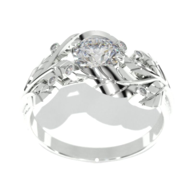 1.0 Carat Moissanite Center Stone (D-Colorless, VVS1-Clarity, Ex-Cut, Ex-Polish, VG-Symmetry) and 6-Accents (0.03 CTW) in 14K White Gold.