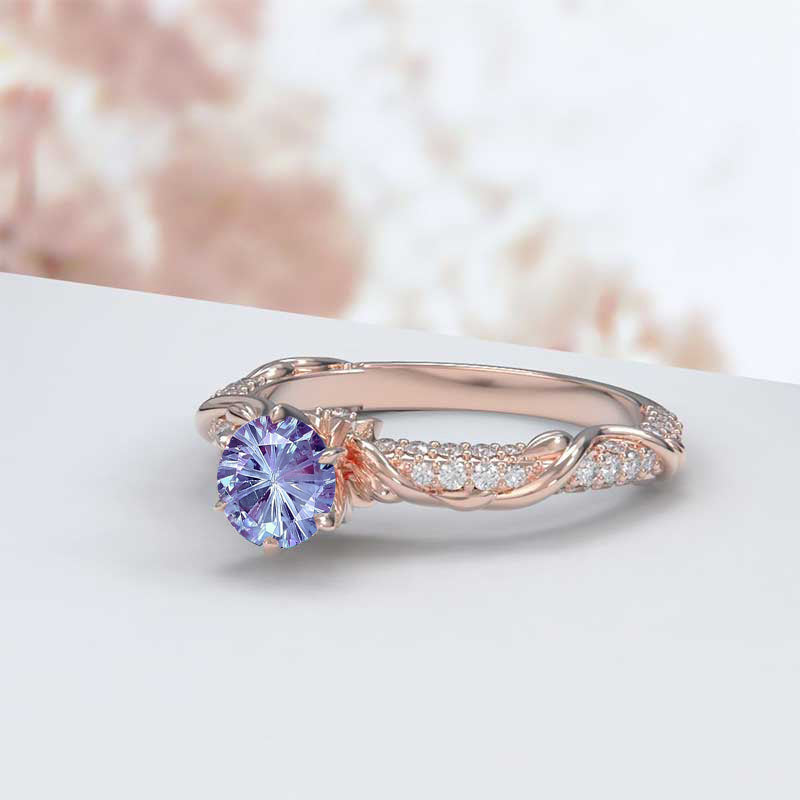 The default design option features 0.8 Carat 6mm Fireworks Cut Ethically Lab-Grown Alexandrite Center Stone and 0.5 CTW  Moissanite D-Colorless, VVS1-Clarity, VG-Cut, Ex-Polish, VG-Symmetry Accent Stones ( Colorless)