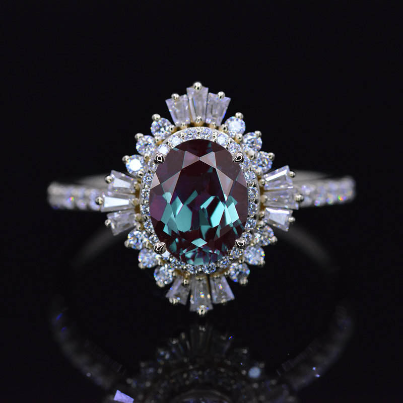The default design option features 8x6mm Oval Ethically LAB-Grown Alexandrite Center Stone VVS1-Clarity, VG-Cut, Ex-Polish, VG-Symmetry