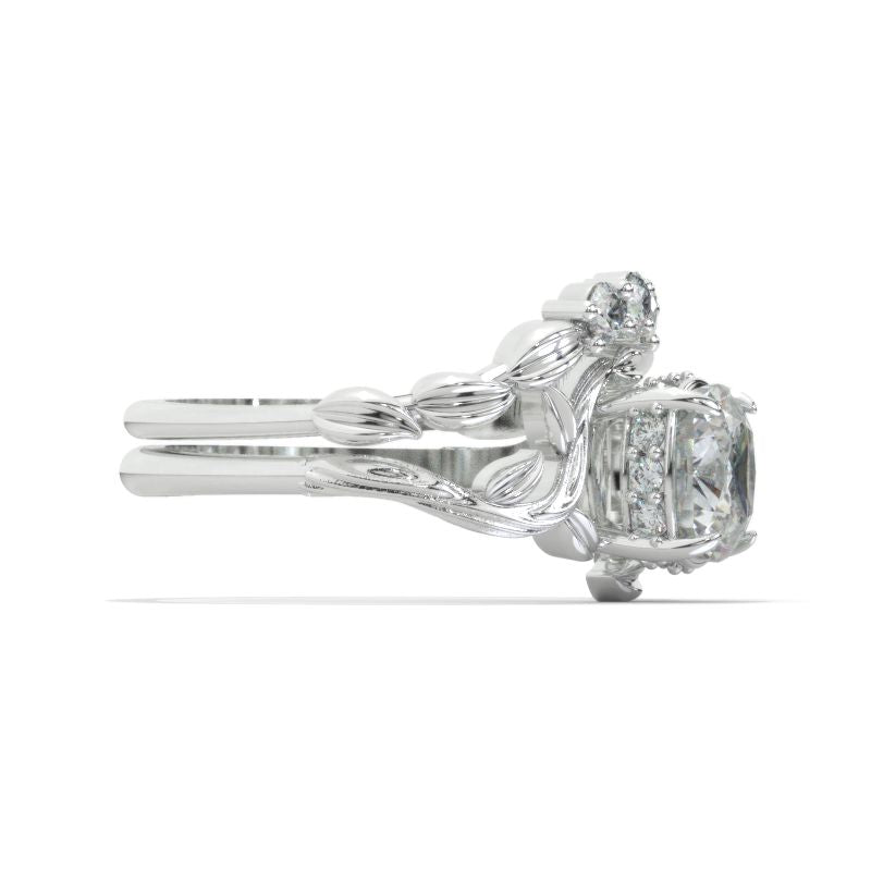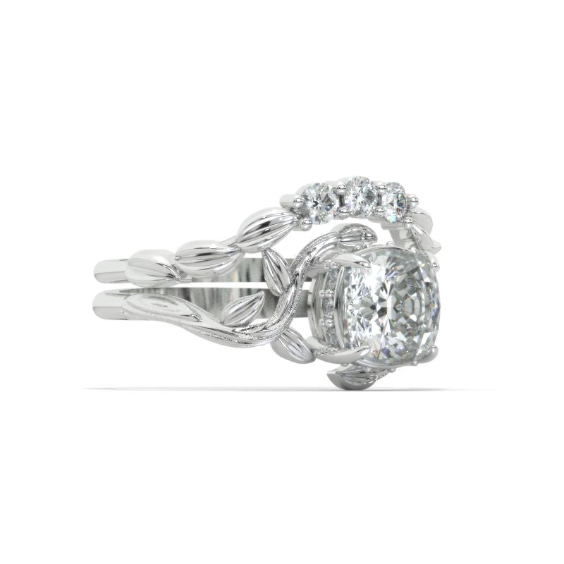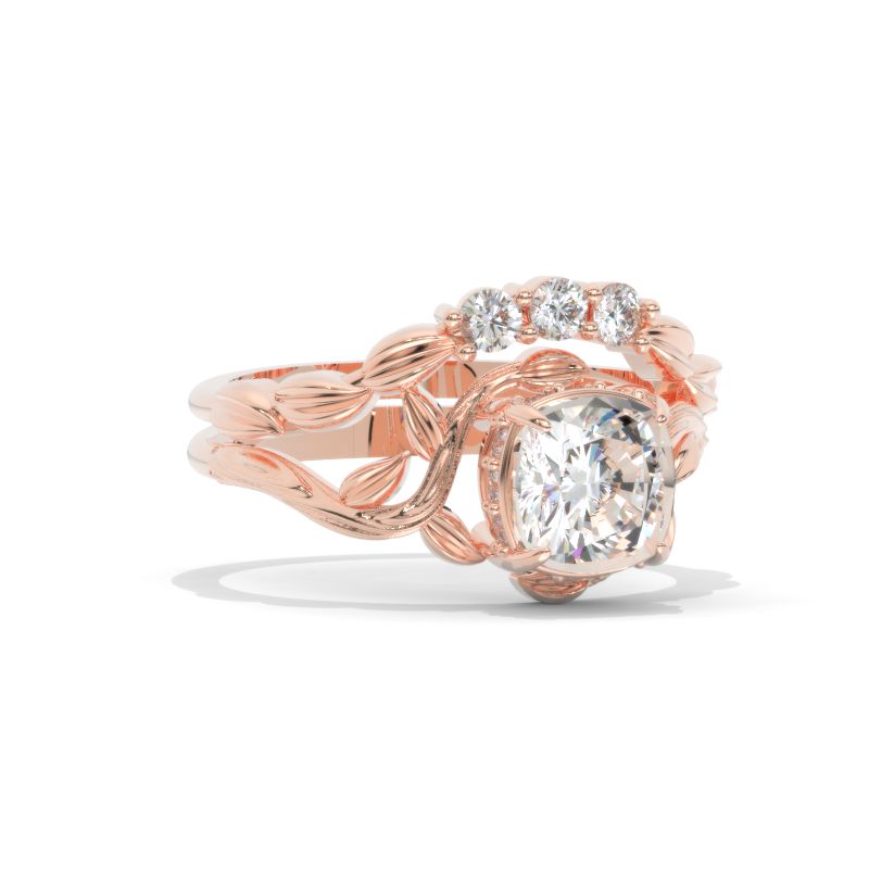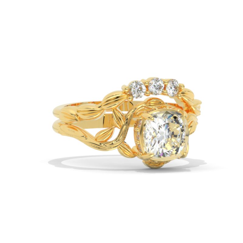 The default design option features 1.5 Carat 7x7mm Cushion Cut Giliarto Moissanite Center Stone and Moissanite Accents D-Colorless, VVS1-Clarity, VG-Cut, Ex-Polish, VG-Symmetry