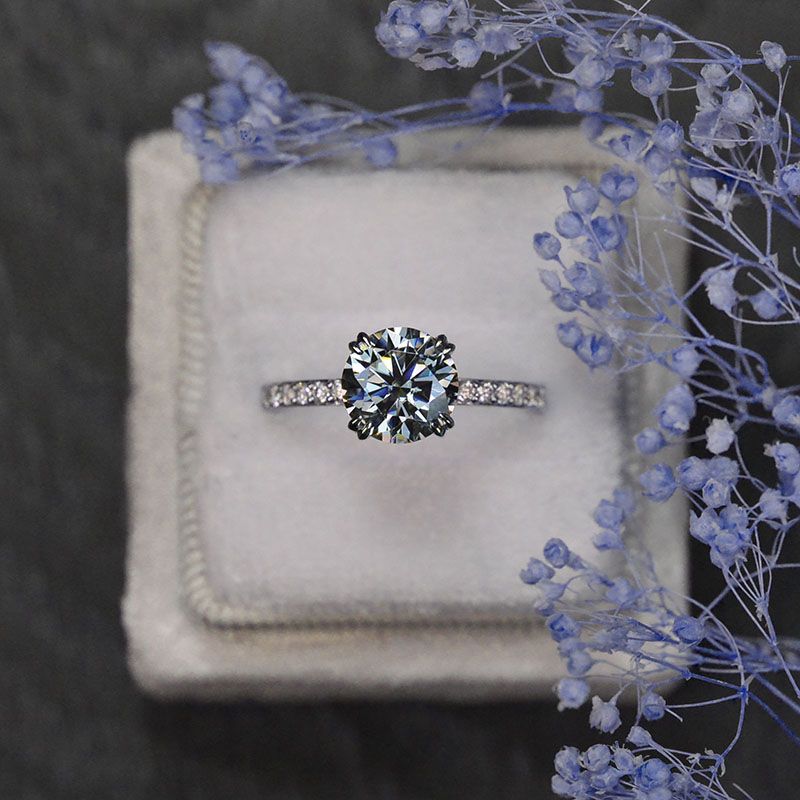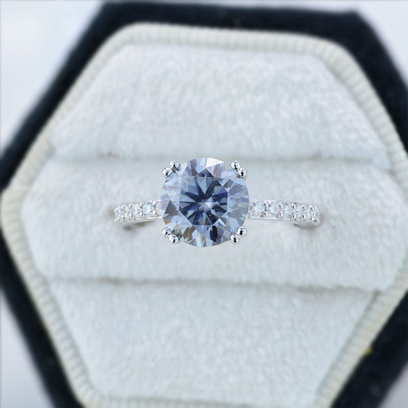 On the image featured 2 carat round dark grey moissanite 8mm round brilliant cut