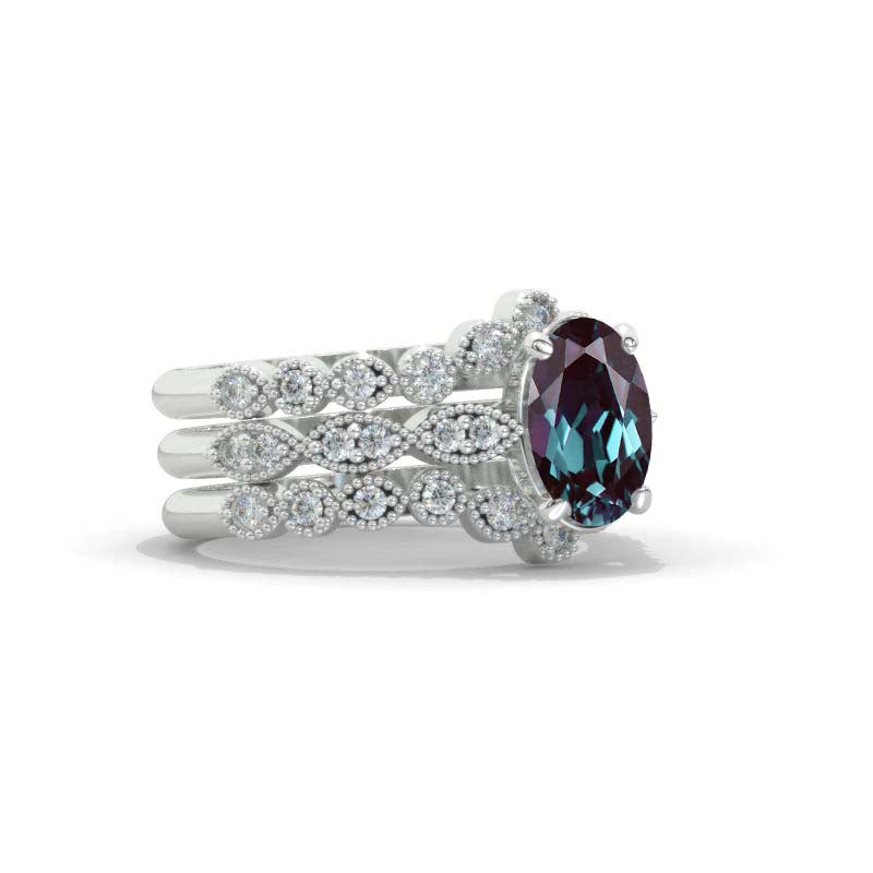1.5 Carat Oval Alexandrite Art Avenue Vintage Halo 14K White Gold Floral Engagement Ring Set