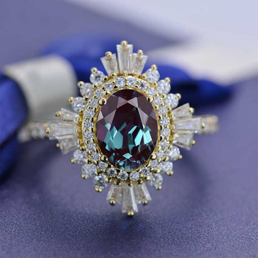 1.5 Carat Oval Alexandrite Cut Halo 14K Yellow Gold Engagement Ring - Giliarto