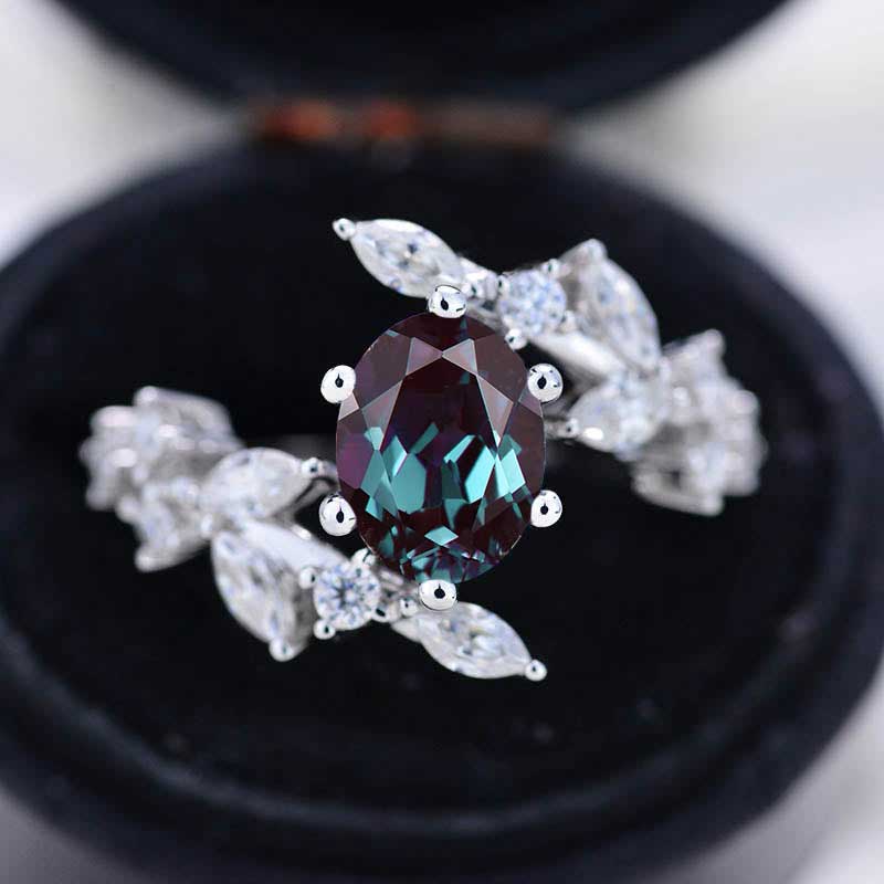 Engagement : 1.5 Carat Oval 8x6mm Ethically Lab-Grown Alexandrite, VG-Cut, Ex-Polish, VG-Symmetry Center Stone with 38 Colorless 1.5 CTW Moissanite