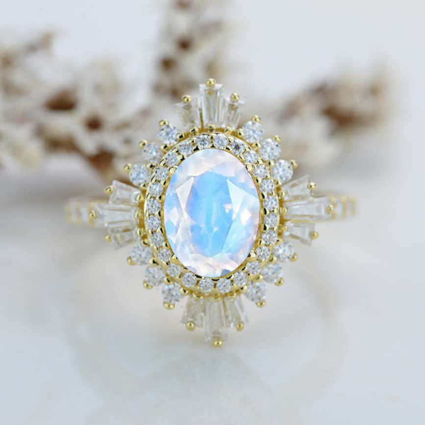 1.5 Carat Oval Genuine Moonstone Cut Halo 14K Yellow Gold Engagement R - Giliarto