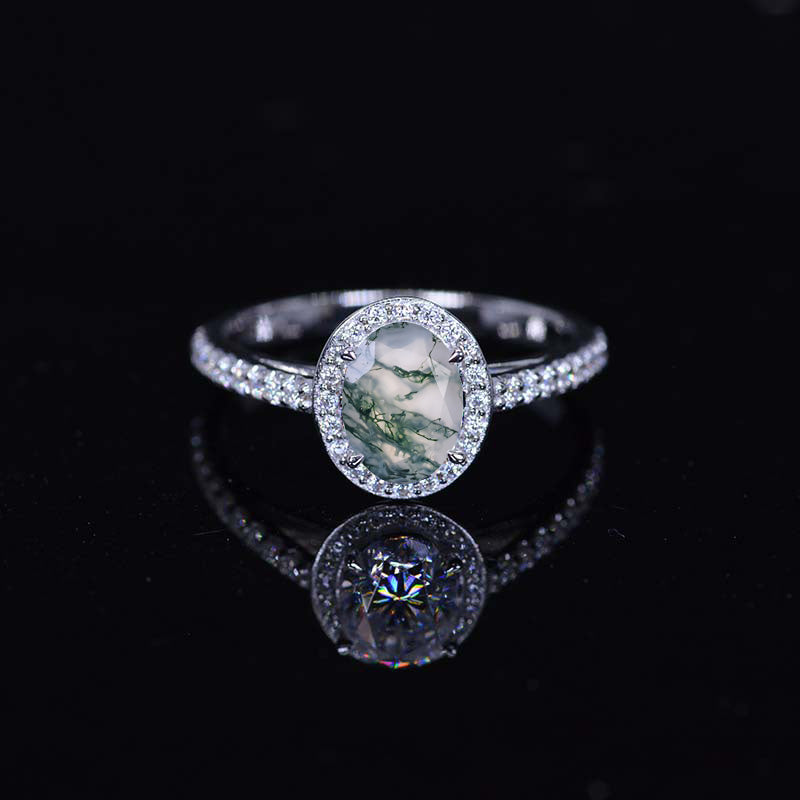 1.5 Carat Oval Genuine Moss Agate Halo Engagement Ring Model-1002
