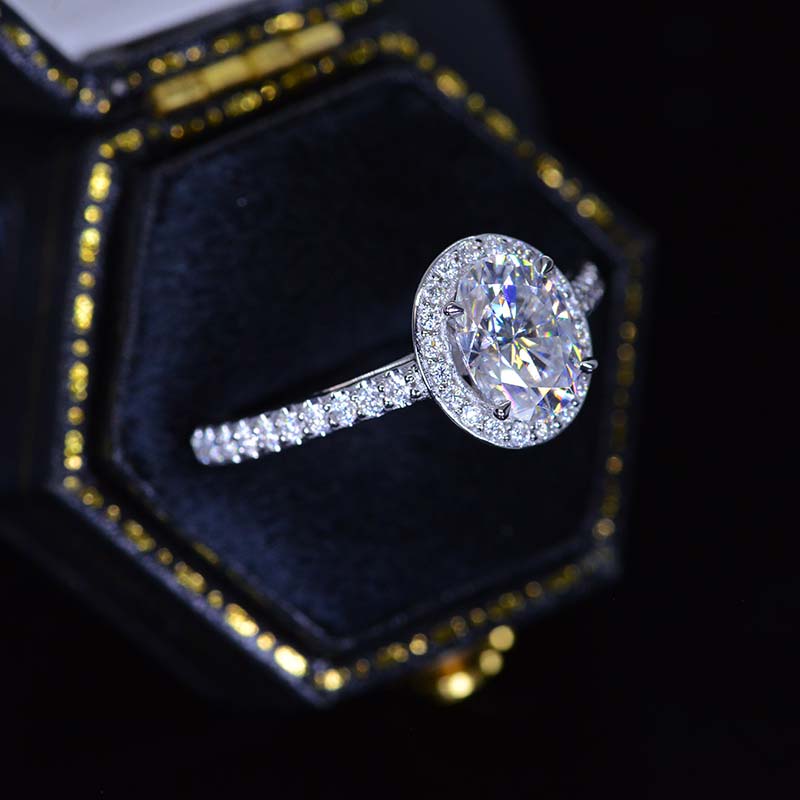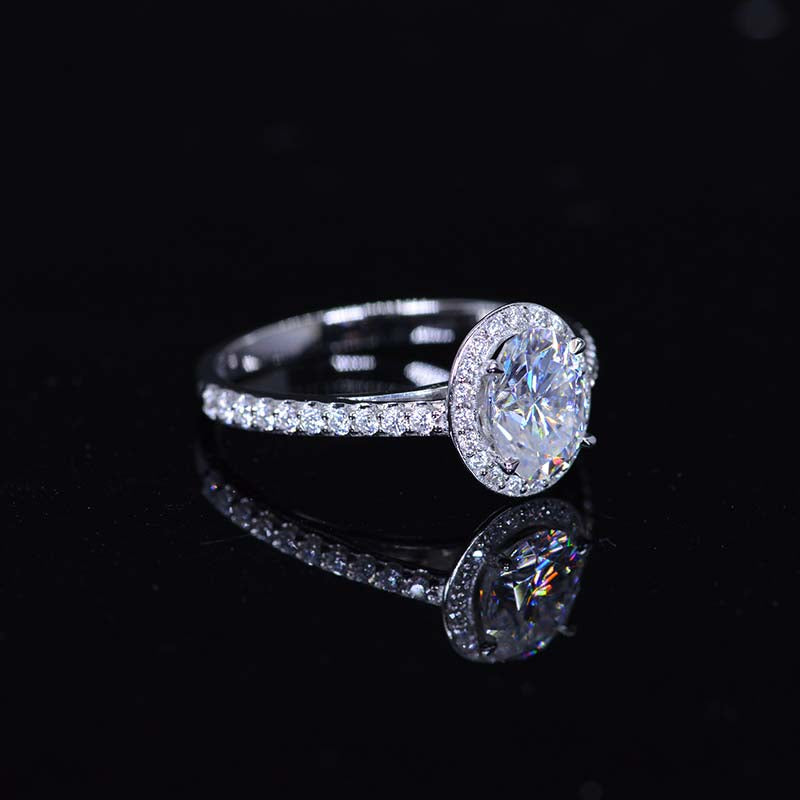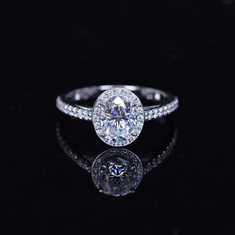 1.5 Carat Moissanite 8x6mm Oval Center Stone D-Colorless, VVS1-Clarity, Ex-Cut, Ex-Polish, VG-Symmetry with 38-0.35 CTW Moissanite (D-Colorless, VVS1 clarity) French-Set Accent Stones 14K White Gold Ring.