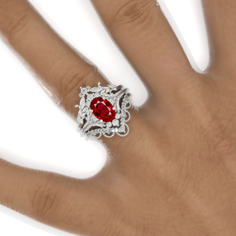 Engagement Ring: 1.5 Carat Ethically Lab-Grown Ruby AAA+ Grade Oval 8x6mm VG-Cut, Ex-Polish, VG-Symmetry Center Stone set with D- Colorless Moissanite Accent Stones in 14K White Gold Ring.