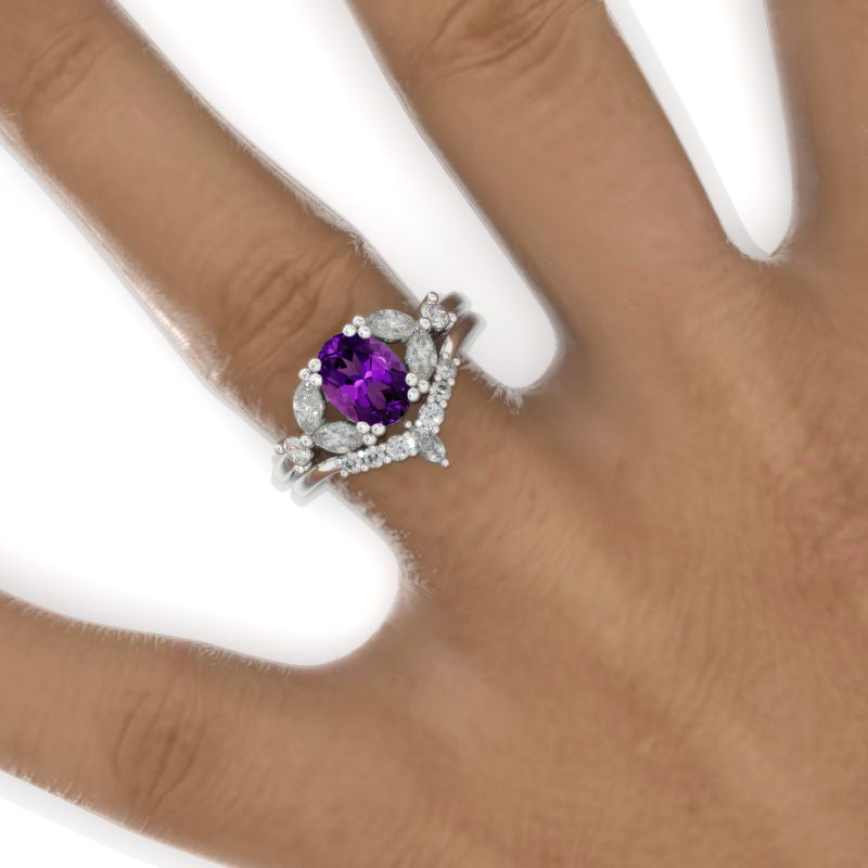 Engagement Ring: 1.5 Carat Genuine Natural Amethyst- AAAA Grade Oval 8x6mm VG-Cut, Ex-Polish, VG-Symmetry Center Stone set with D- Colorless Moissanite Accent Stones in 14K White Gold Ring.