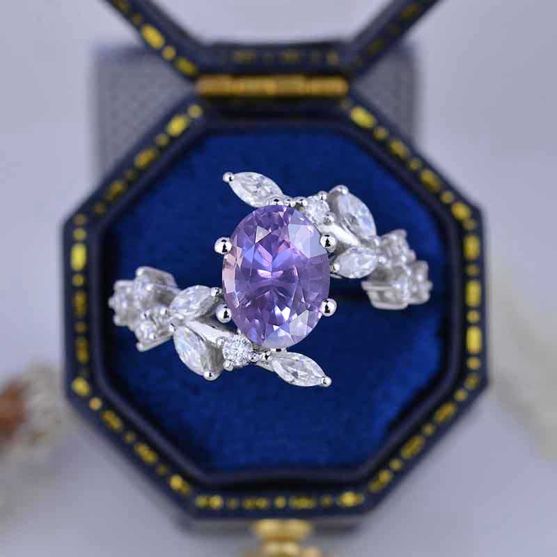 Engagement : 1.5 Carat Oval 8x6mm Ethically Lab-Grown Purple Sapphire VVS1-Clarity, VG-Cut, Ex-Polish, VG-Symmetry Center Stone with 38 Colorless 1.5 CTW Moissanite