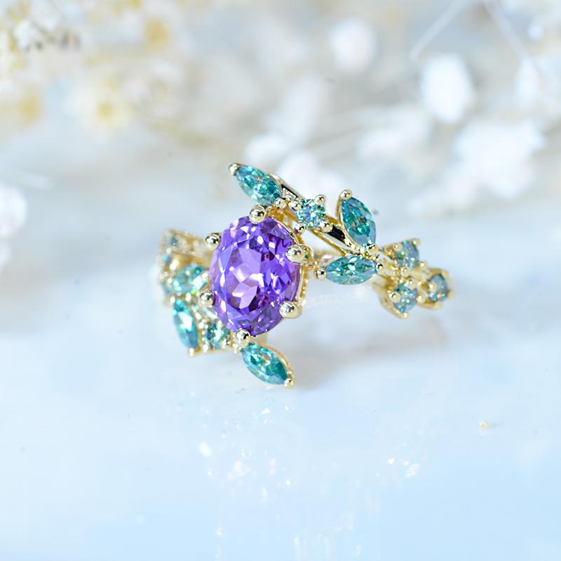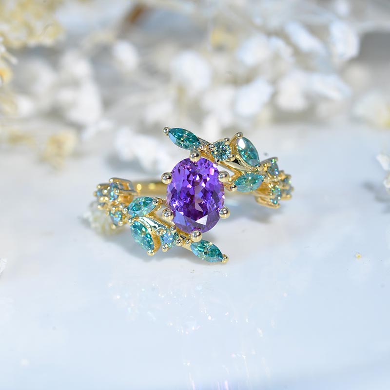 1.5 Carat Oval Purple Sapphire Floral 18K Yellow Gold Engagement Ring - Giliarto
