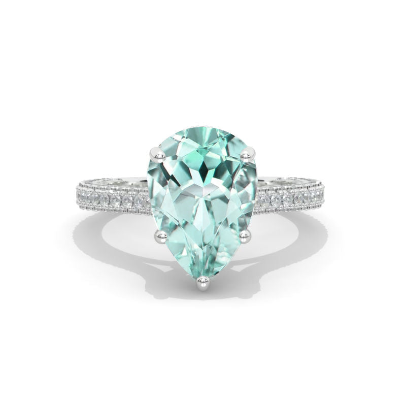 The default design option features approximately 1.5 Carat Ethically Lab-Grown Mint Sapphire Pear 9x7mm Mint-Color VG-Cut,Ex-Polish, VG-Symmetry Center Stone set with D- Colorless Moissanite Accent Stones