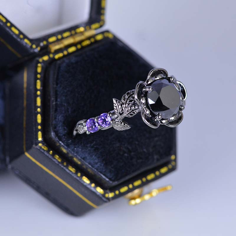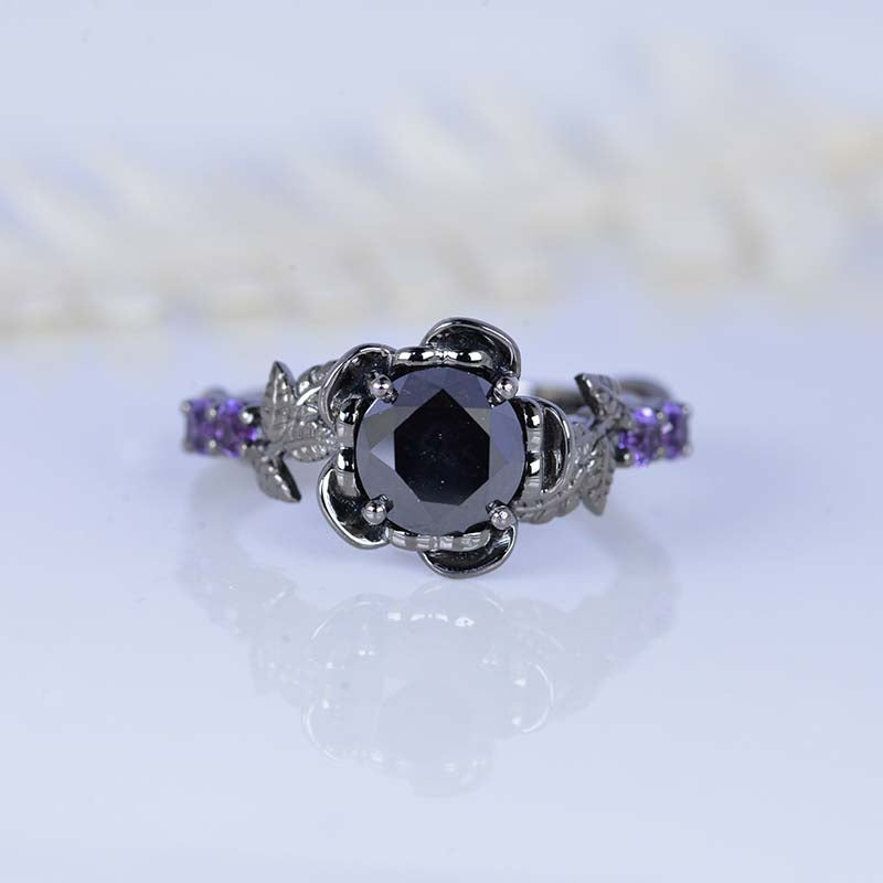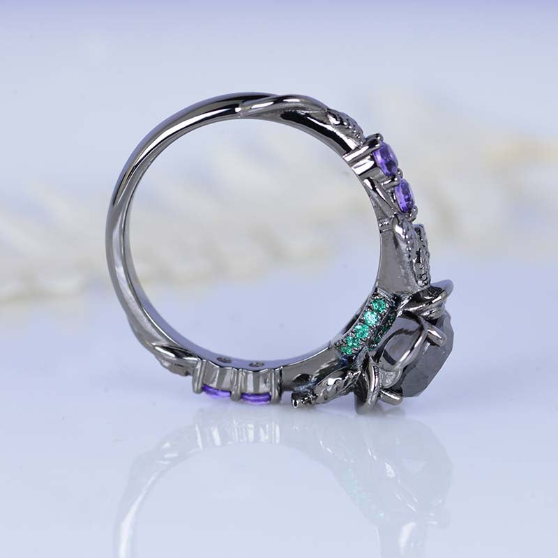 1.5 Carat Black Moissanite Round  7mm VG-Cut, Ex-Polish, VG-Symmetry Center Stone with Emerald and Amethyst Accent Stones 14K Black Gold Ring.