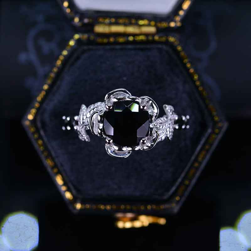 1.5 Carat Black Moissanite Round  7mm VG-Cut, Ex-Polish, VG-Symmetry Center Stone with Emerald and Amethyst Accent Stones 14K Gold Ring.