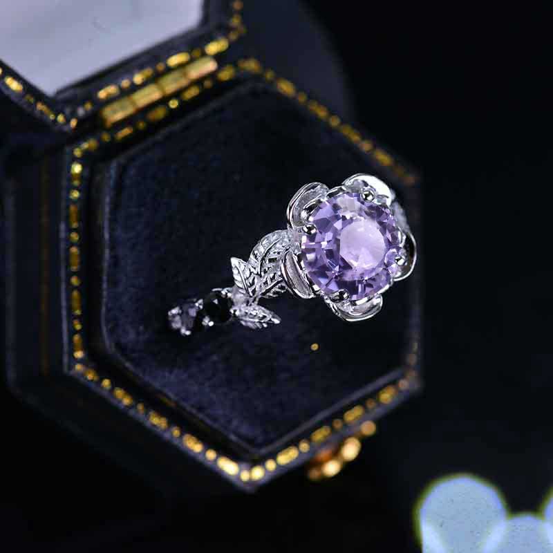 1.5 Carat Round Black Purple Sapphire Floral Halo Engagement Ring - Giliarto