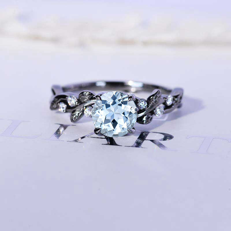 1.5 Carat Round Brilliant Cut Natural Aquamarine Floral Black Gold Engagement Ring