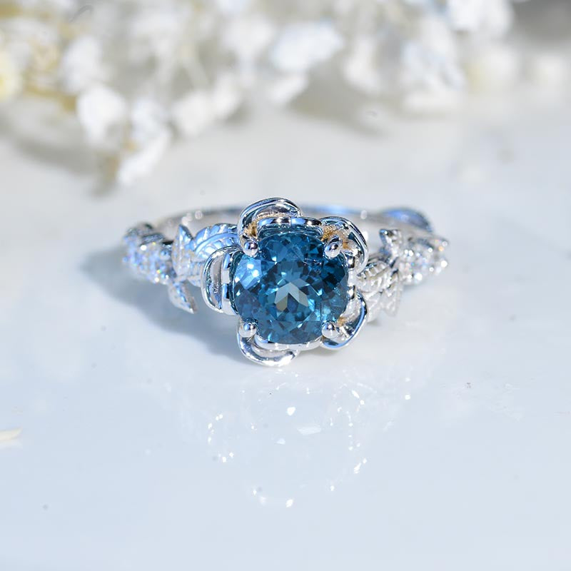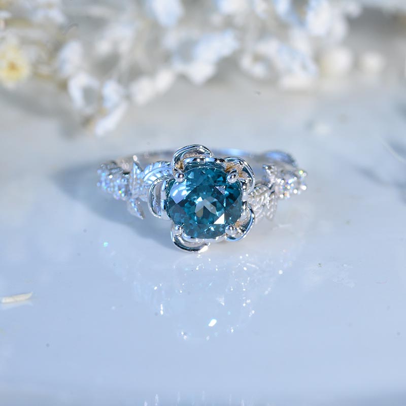 1.5 Carat Round Teal Sapphire Floral Halo Engagement Ring - Giliarto