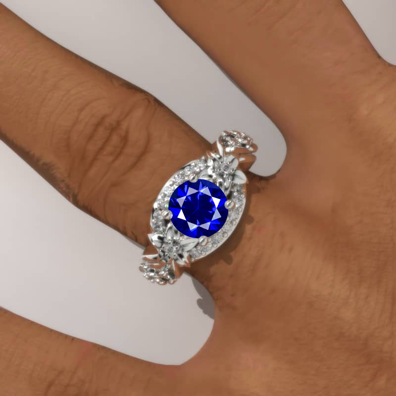 1.5 Carat Royal Blue Sapphire Gold Floral Engagement Ring Model 7