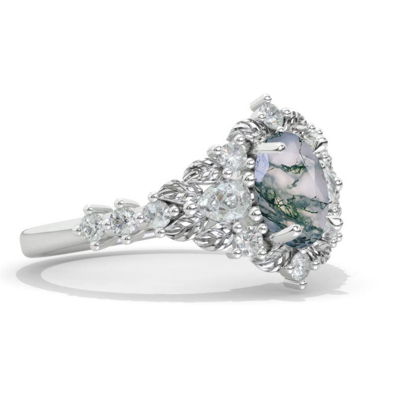 The default design option features 8x6mm Oval Cut Genuine Moss Agate Stones,Ā VVS1-Clarity, VG-Cut, Ex-Polish, VG-Symmetry