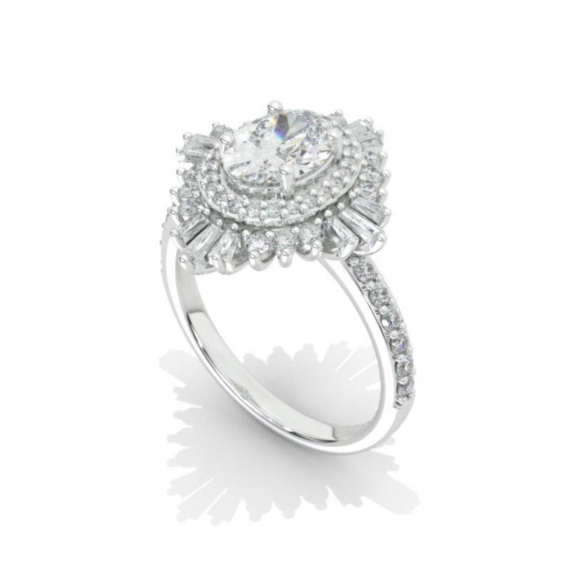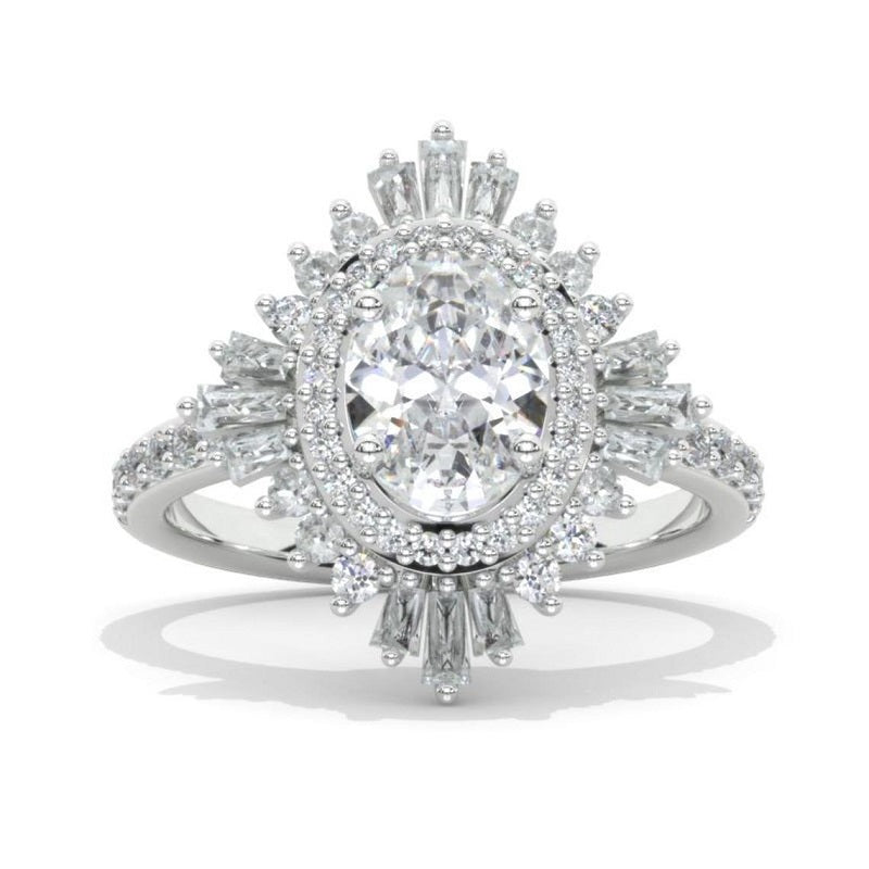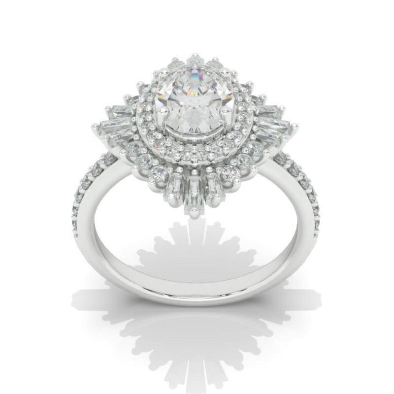 The default design option features approximately 1.5+ Carat LAB-Grown Diamond 8x6mm Oval Center Stone, D-Colorless, VVS1-Clarity, VG-Cut, Ex-Polish, VG-Symmetry