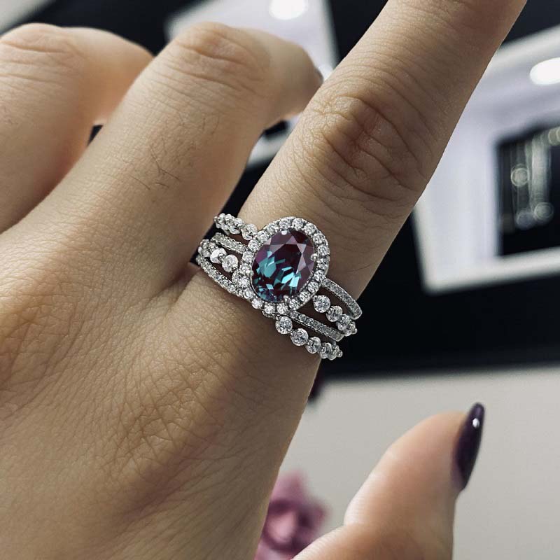 The default design option features 8x6mm Oval Cut Ethically LAB-Grown Alexandrite stones, VVS1-Clarity, VG-Cut, Ex-Polish, VG-Symmetry