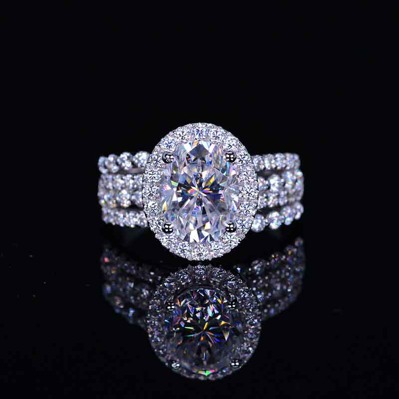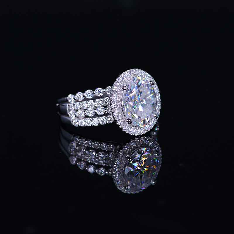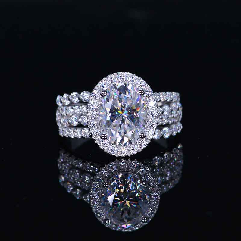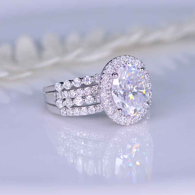 The default design option features 9x7mm Oval Cut Moissanite stonesD-Colorless, VVS1-Clarity, VG-Cut, Ex-Polish, VG-Symmetry