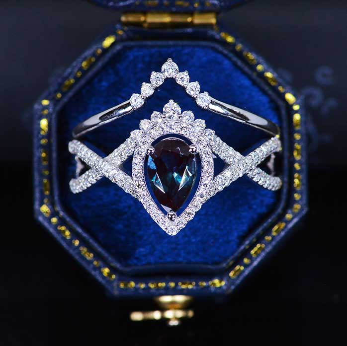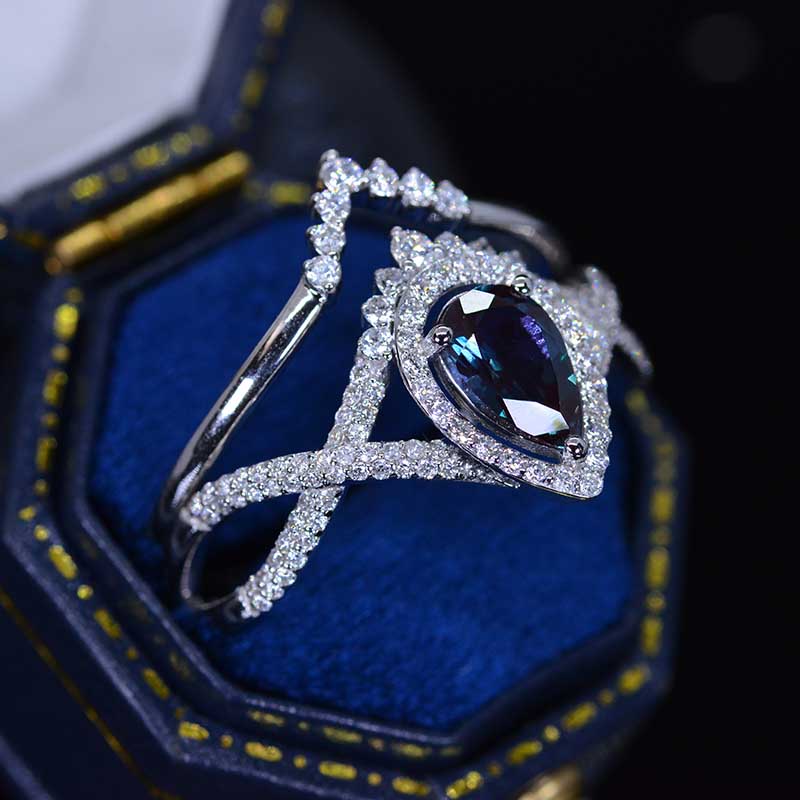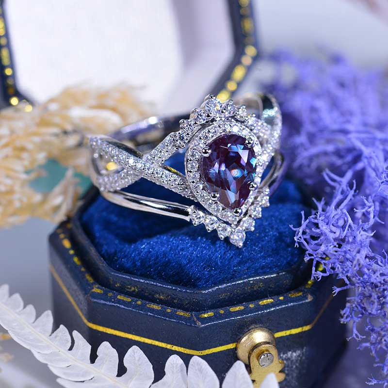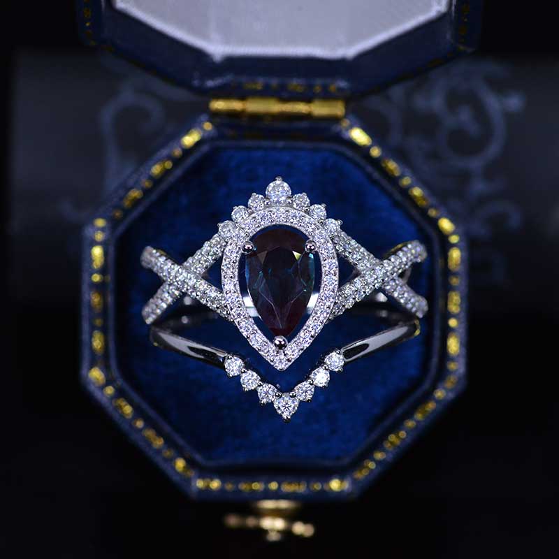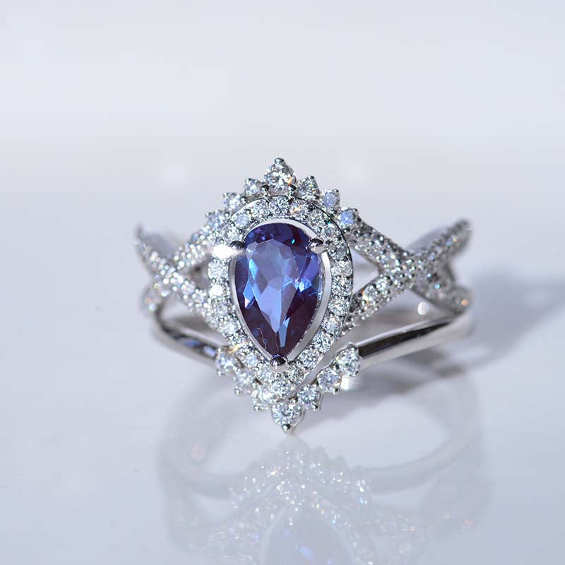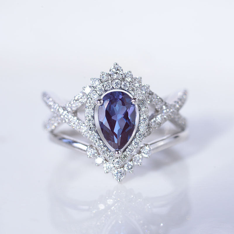 The default design option features 1.5 Carat 8x6mm Pear Ethically Lab-Grown Alexandrite Center Stone,