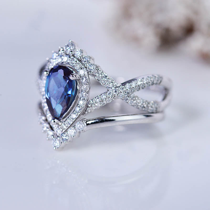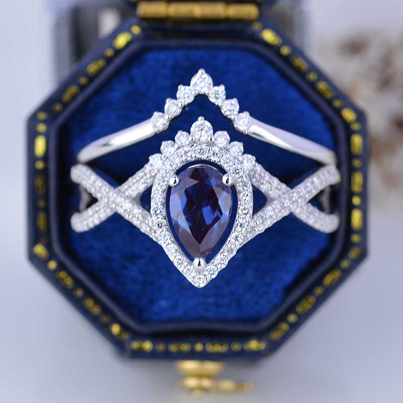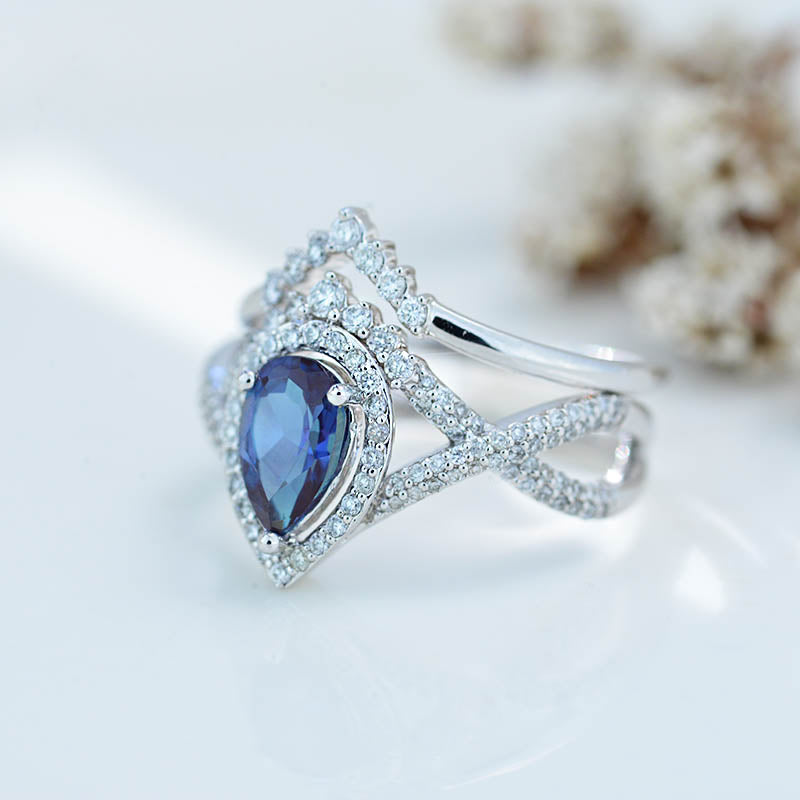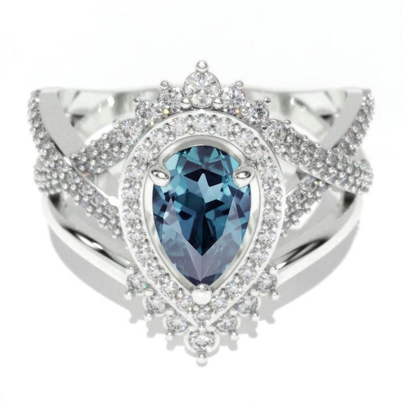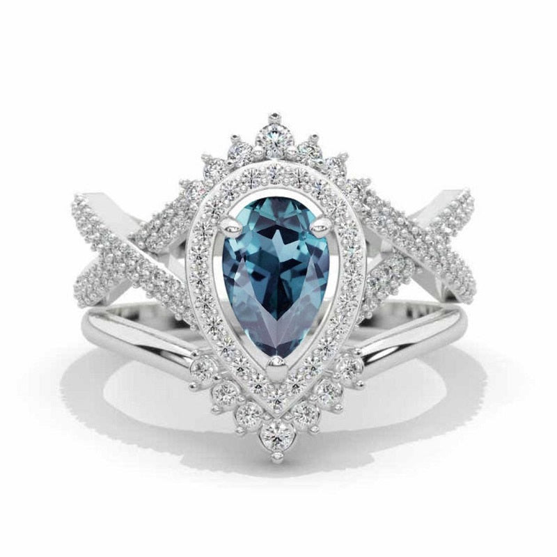 1.5CT Pear Alexandrite Halo Engagement Ring. 14K Solid Gold Ring Vintage Anniversary Eternity Gold Ring Set.