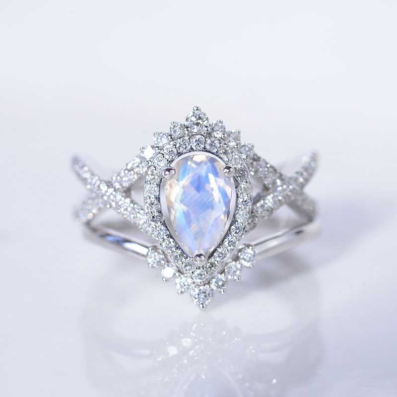 The default design option features 1.5 Carat 8x6mm Pear Genuine Moonstone Center Stone, VVS1 - Clarity, VG-Cut, Ex-Polish, VG-Symmetry set with D-Colorless Moissanite Accent Stones