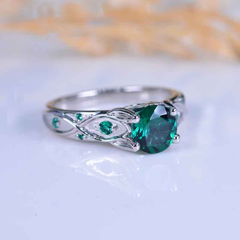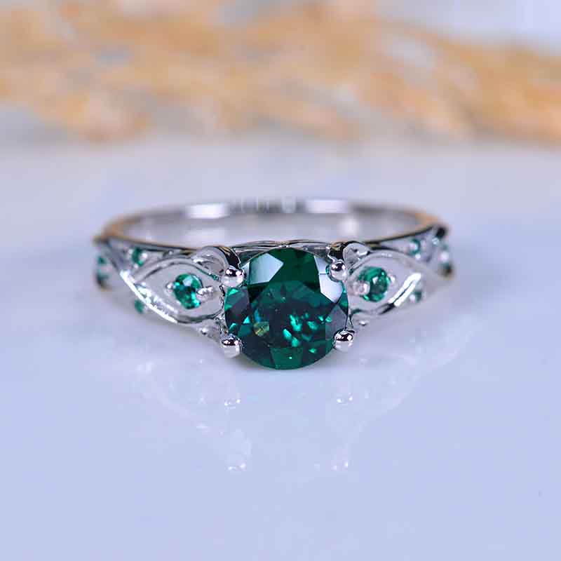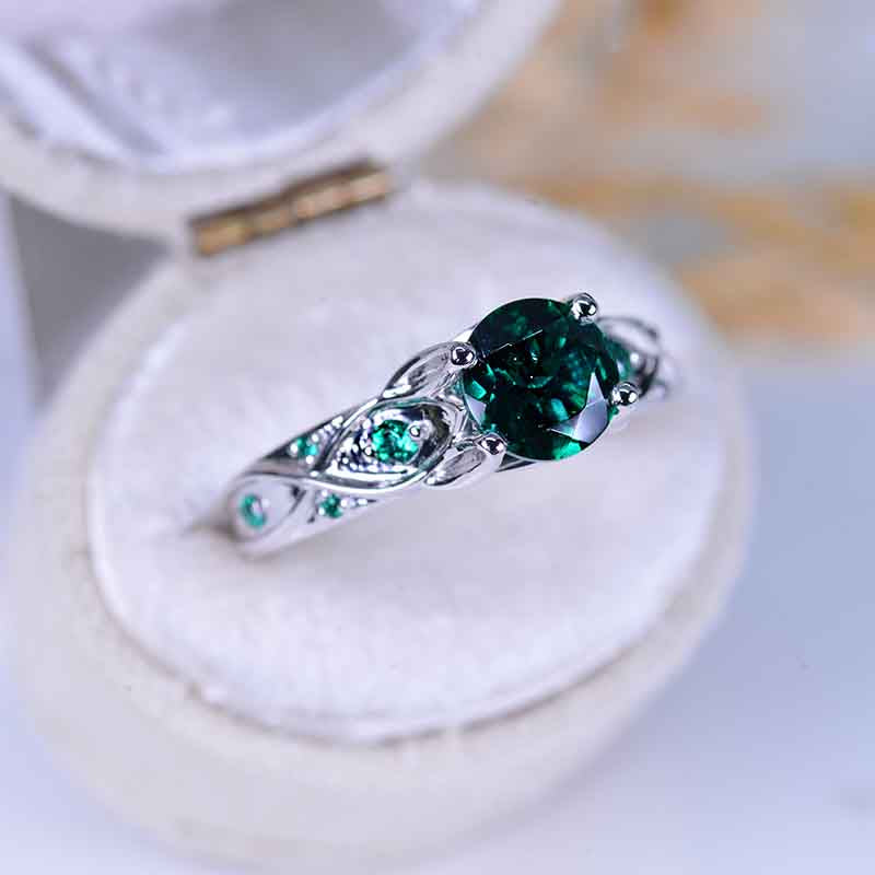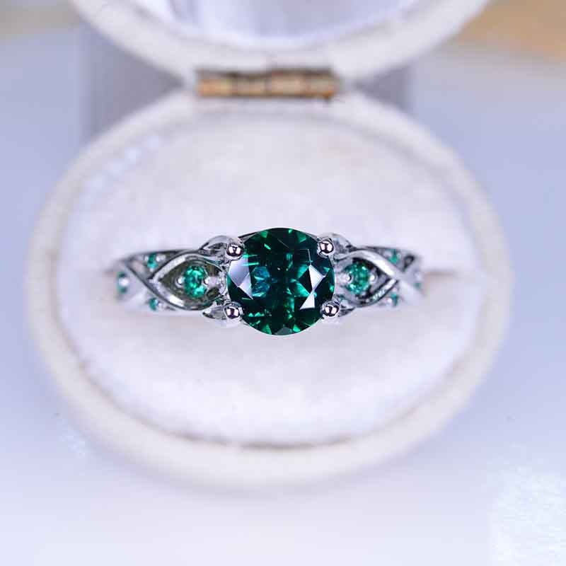 Emerald Center Stone - Round 7 mm, Ethically Lab-Grown, VVS1-Clarity, Ex-Cut, Ex-Polish, VG-Symmetry) and 8-Accents  0.1 CTW with 14K Gold or Black Platinum.
