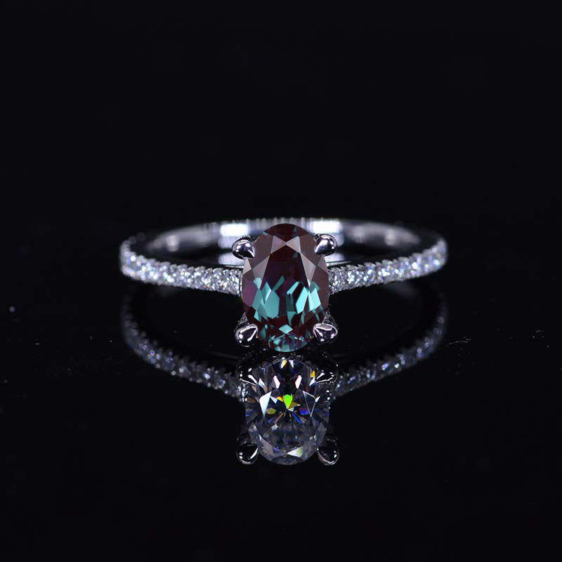 1 Carat Oval Cut Ethically Lab-Grown Alexandrite 7x5mm Center Stone, Ice Crushed Cut, Ex-Polish, VG-Symmetry with 0.4 CTW D-Colorless Moissanite Accents 14K White Gold.