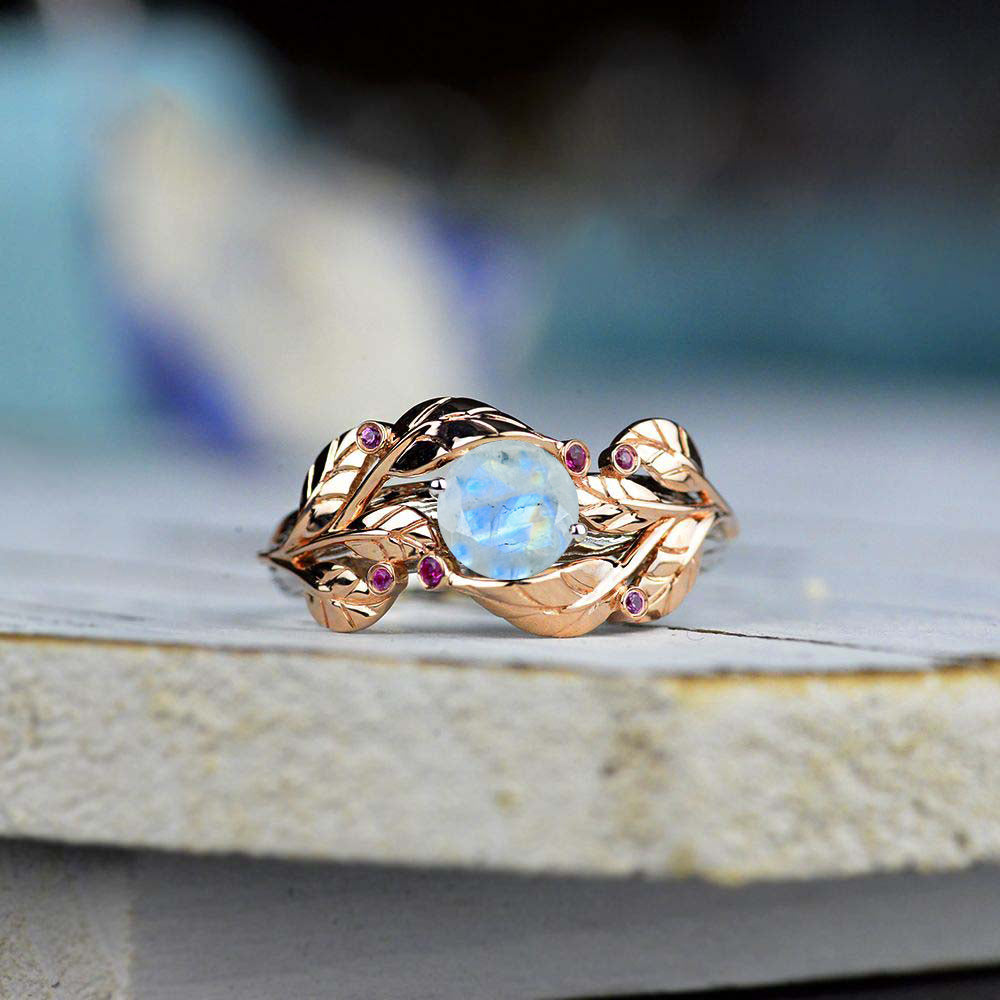 1 Carat Genuine Moonstone Engagement Ring 14K Rose and White Gold-6 Genuine Ruby Accents