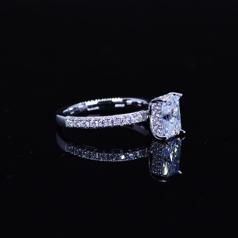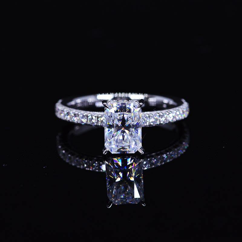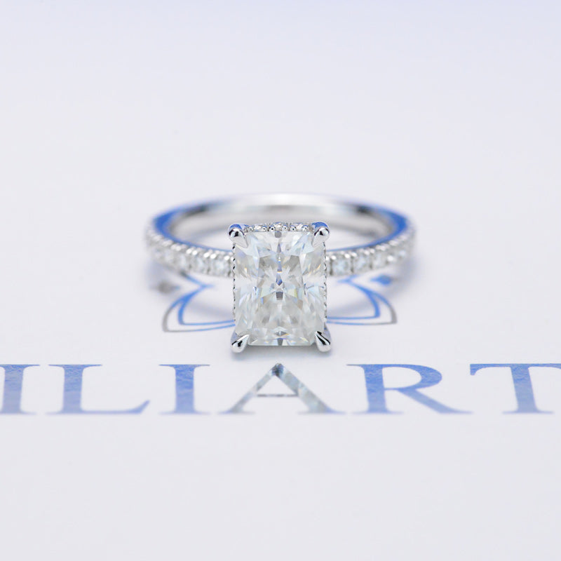 The design features approximately 1 Carat Giliarto Moissanite- Radiant 7x5mm D-Colorless, VVS1-Clarity,VG-Cut,Ex-Polish, VG-Symmetry Center Stone, 0.5 CTW D- Colorless Moissanite Accents StonesÂ