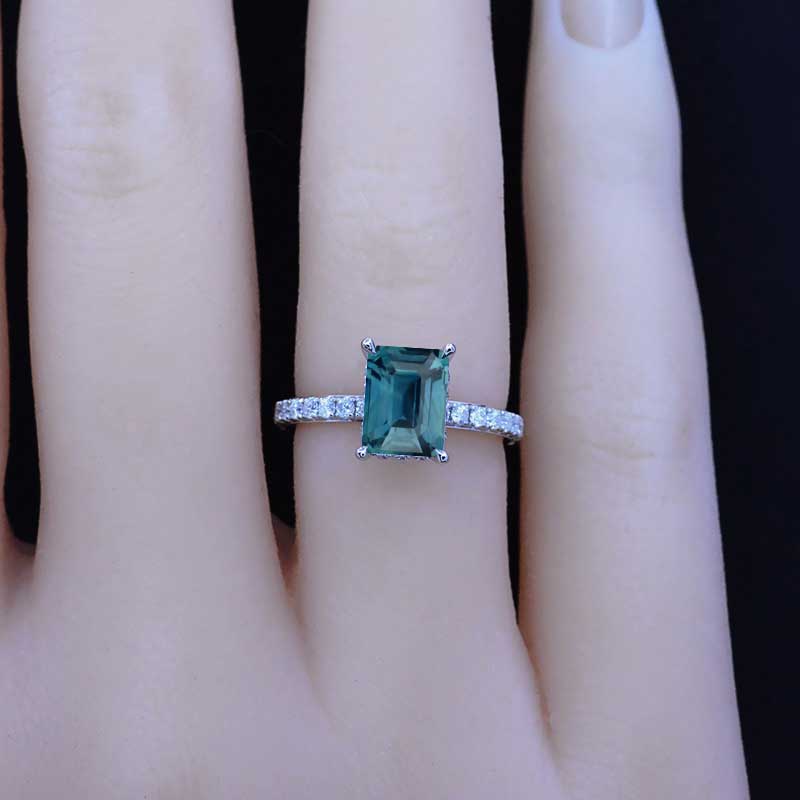 The design features approximately 1 Carat Ethically Lab-Grown Teal Sapphire- Radiant  7x5mm, VG-Cut,Ex-Polish, VG-Symmetry Center Stone, 0.5 CTW D- Colorless Moissanite  Accents Stones