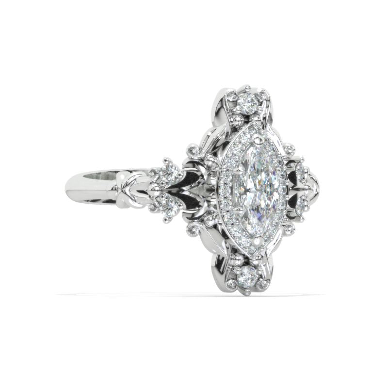 1 Carat Marquise 14K Solid Gold Ring Marquise Moissanite Halo Vintage Wedding Ring. Engagement Ring Anniversary Ring, Baguette Side Stones Ring Model 1161