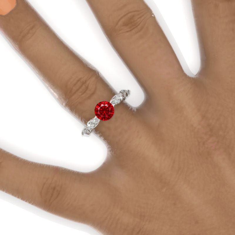 The default design option features 7mm Round Ethically Lab-Grown Ruby AAA+ Grade  Center Stone: 0.1 CTW  D-Colorless, VVS1-Clarity, VG-Cut, Ex-Polish, VG-Symmetry Accent Stones ( Colorless)