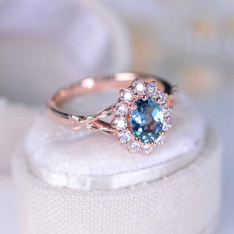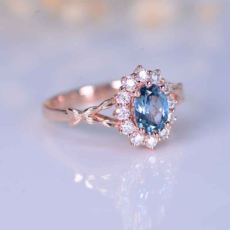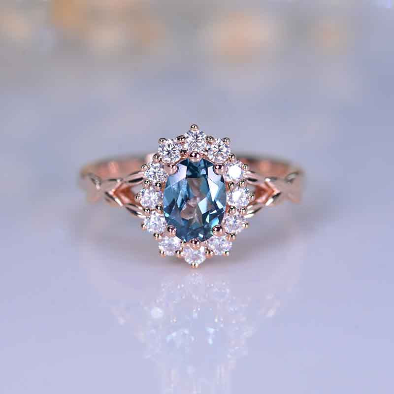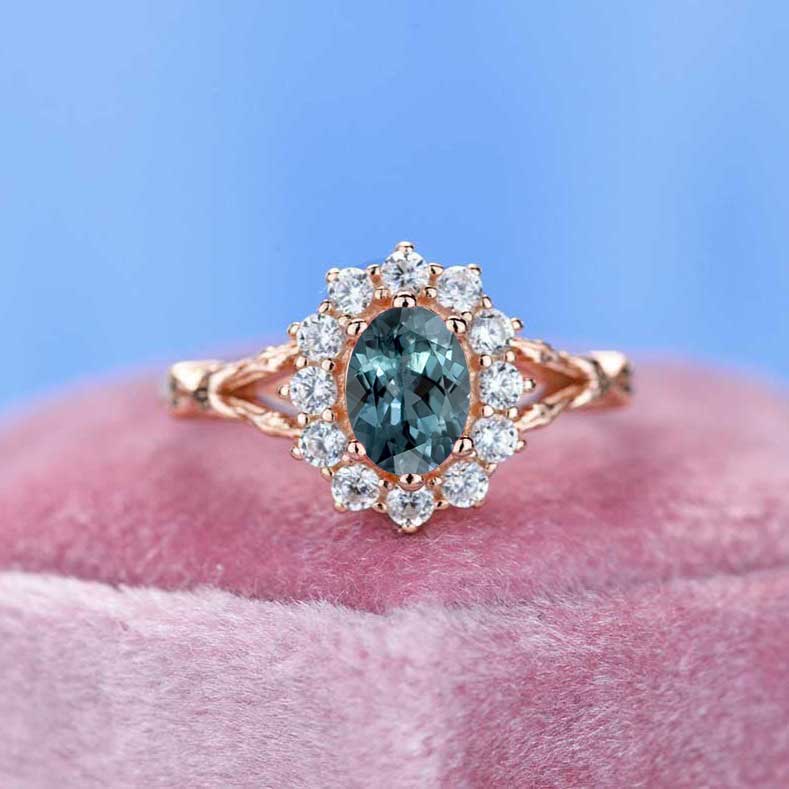 1 Carat Oval Cut Vintage Rose Teal Sapphire Ring, Rose Gold Floral Unique Oval Halo Ring