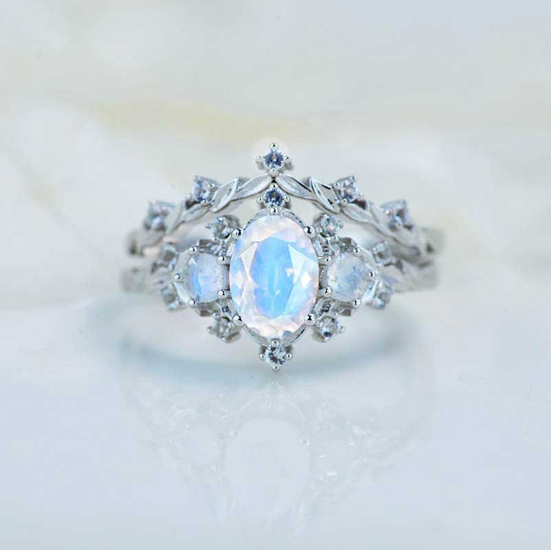 1 Carat Oval Genuine Moonstone Halo 14K White Gold Floral Engagement Ring Set